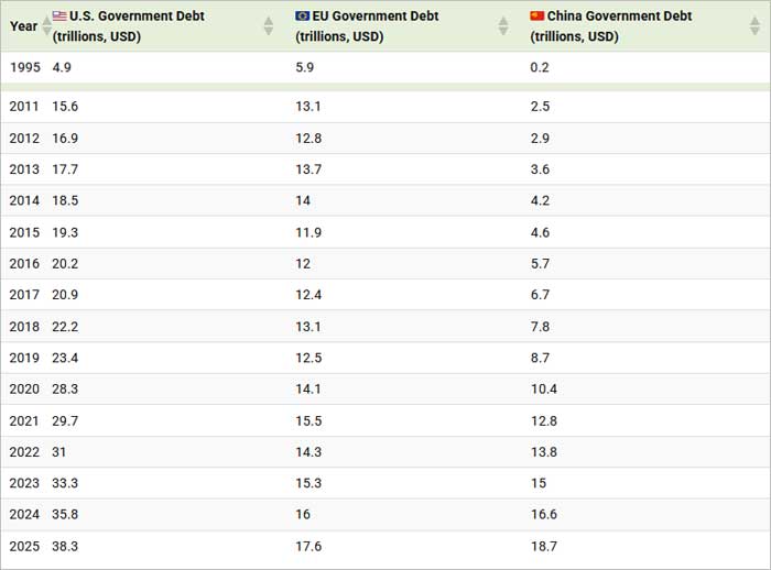 Изданието показва годишните общи държавни дългове за САЩ, ЕС и Китай от 1995 до 2025 г. в текущи щатски долари (некоригирани спрямо инфлацията), използвайки данни от МВФ.