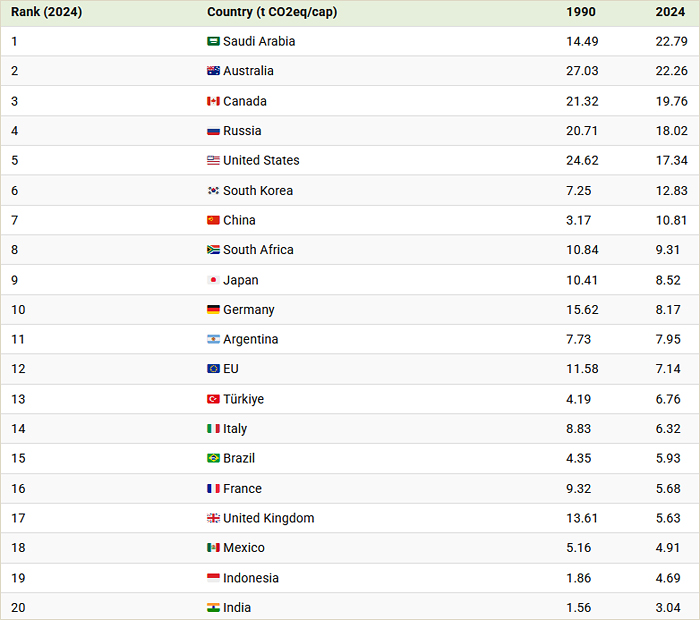 Изданието Visual Capitalist проследява емисиите на парникови газове на глава от населението в страните от Г-20 от 1990 до 2024 г., използвайки информацията от базата данни EDGAR на Европейската комисия. Отчитат се емисиите на CO₂-еквивалент в тонове на глава от населението. Земеползването, промените в земеползването и горското стопанство не са включени.