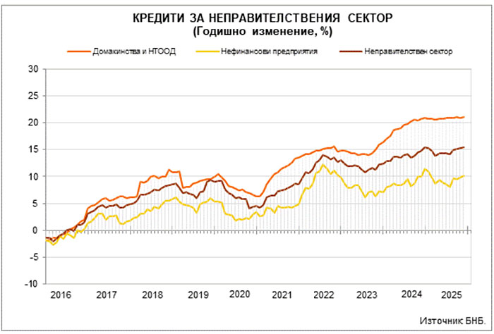 Общо кредитите за домакинствата са 56.139 млрд. лв. (25% от БВП). Спрямо декември 2024 г. те се увеличават с 21.1% (20.9% годишно повишение през ноември 2025 година).
