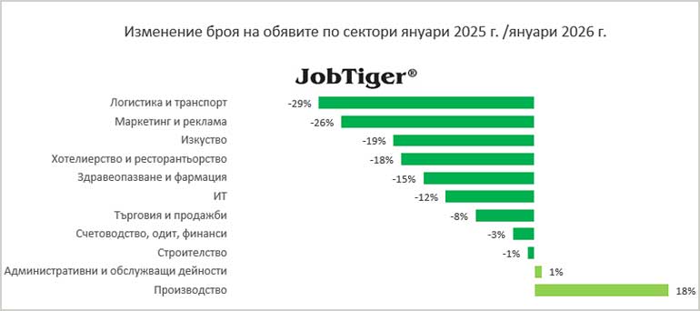 През януари 2026 година се наблюдава 5% спад на предложенията за работа спрямо година по-рано, сочи анализът на JobTiger. В същото време от компаниято обръщат внимание, че спрямо предходния месец декември пазарът на труда се възстановява с месечен ръст от 72% (40580 броя обяви за работа).