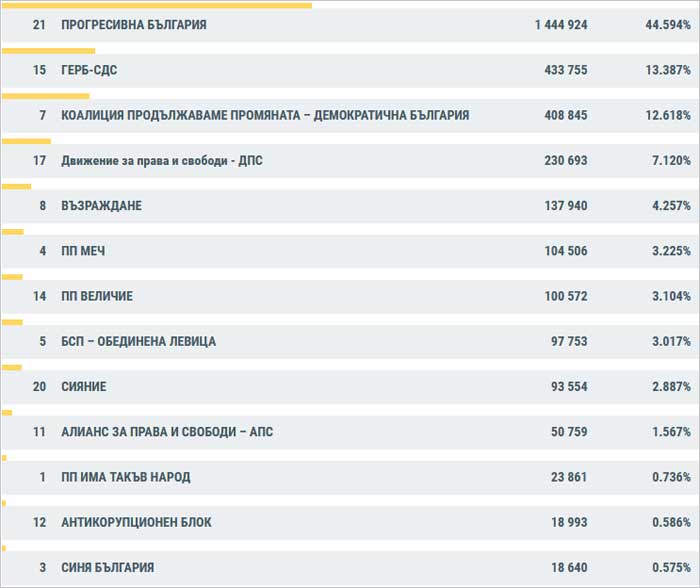 Така, към 15 часа, при 100% обработени протоколи, победителят е ясно видим, парламентът ще е от пет партии и за първи път в новата ни политическа история без традиционната левица БС, които явно не успяха да преодолеят огромния негатив от прегръдката с ГЕРБ и Пеевски в предишното редовно правителство.