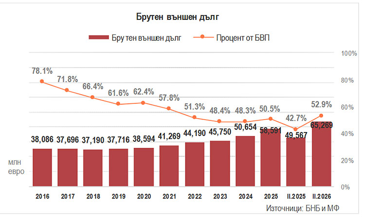 Брутният външен дълг1 в края на февруари 2026 г. възлиза на 65 269 млн. евро (52.9% от БВП2), което е с 15 702.3 млн. евро (31.7%) повече в сравнение с края на февруари 2025 г. (49 566.7 млн. евро, 42.7% от БВП).