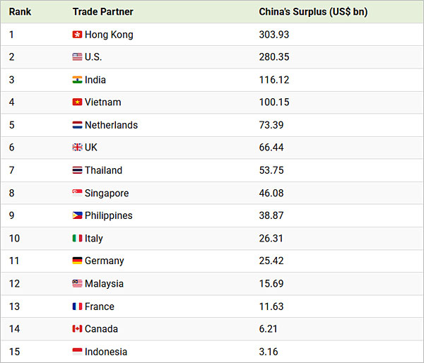 Непосредствено след Хонконг се нареждат Съединените щати с 280 милиарда долара, продължавайки дългогодишен търговски дисбаланс. Индия и Виетнам, с над 100 милиарда долара всяка, подчертават задълбочаващите се търговски връзки на Китай в Азия.