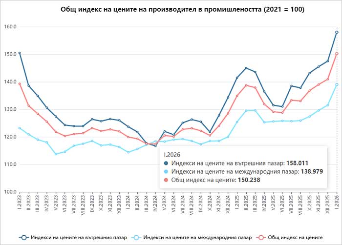 Заводските ни производствени цени отново рязко тръгнаха нагоре. Данни на НСИ сочат, че индексът на цените на производител на вътрешния пазар се повишава със 7.3% през януари 2026 г. спрямо декември 2025 година.