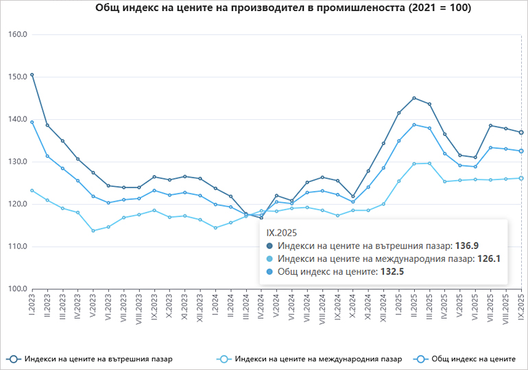 Общият индекс на цените на заводските цени е с 8.4% над нивото му от септември 2024 година. Ръст на цените е регистриран в добивната промишленост – с 22.3%, при производството и разпределението на електрическа и топлоенергия и газ – с 12.0%, и в преработващата промишленост – с 10.8%.